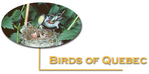 The data presented in this section has been made available courtesy of the Canadian Wildlife Service. Not all of Quebec was surveyed for this data, only the area of Quebec below the 50th parallel. Therefore the range maps indicate the presence of the birds in southern Quebec only. The area was divided into 10 by 10km squares and volunteers were sent into each square to determine which birds were present and breeding. Data collection was carried out over 5 years, between 1984 and 1989, and the information gathered was incorporated into the Breeding Bird Atlas of Quebec. In this section, we present the distribution data for 50 Quebec birds of interest. The texts on individual birds were written by Jake Vander Zanden. |